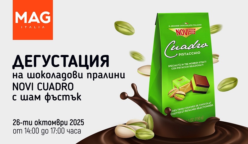 MAG Italia ви кани на сладко преживяване тази неделя – 26 октомври 2025 г., между 14:00 и 17:00 часа, когато ще се проведе специална дегустация на италиански шоколадови пралини NOVI CUADRO, 150 г, с шам фъстък.