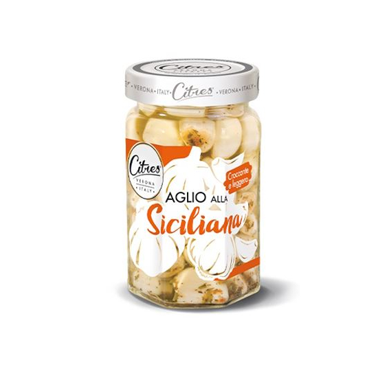 Хрупкав и лек. Съставки: чесън 66% (произход: извън ЕС), слънчогледово олио, винен оцет (вино и вода), захар, сол, черен пипер, магданоз, лют пипер, розмарин, мента, коректор на киселинността: лимонена киселина, антиоксидант: л-аскорбинова киселина. Може да съдържа следи от целина и лупина. След отваряне съхранявайте в хладилник и консумирайте в рамките на 15 дни.